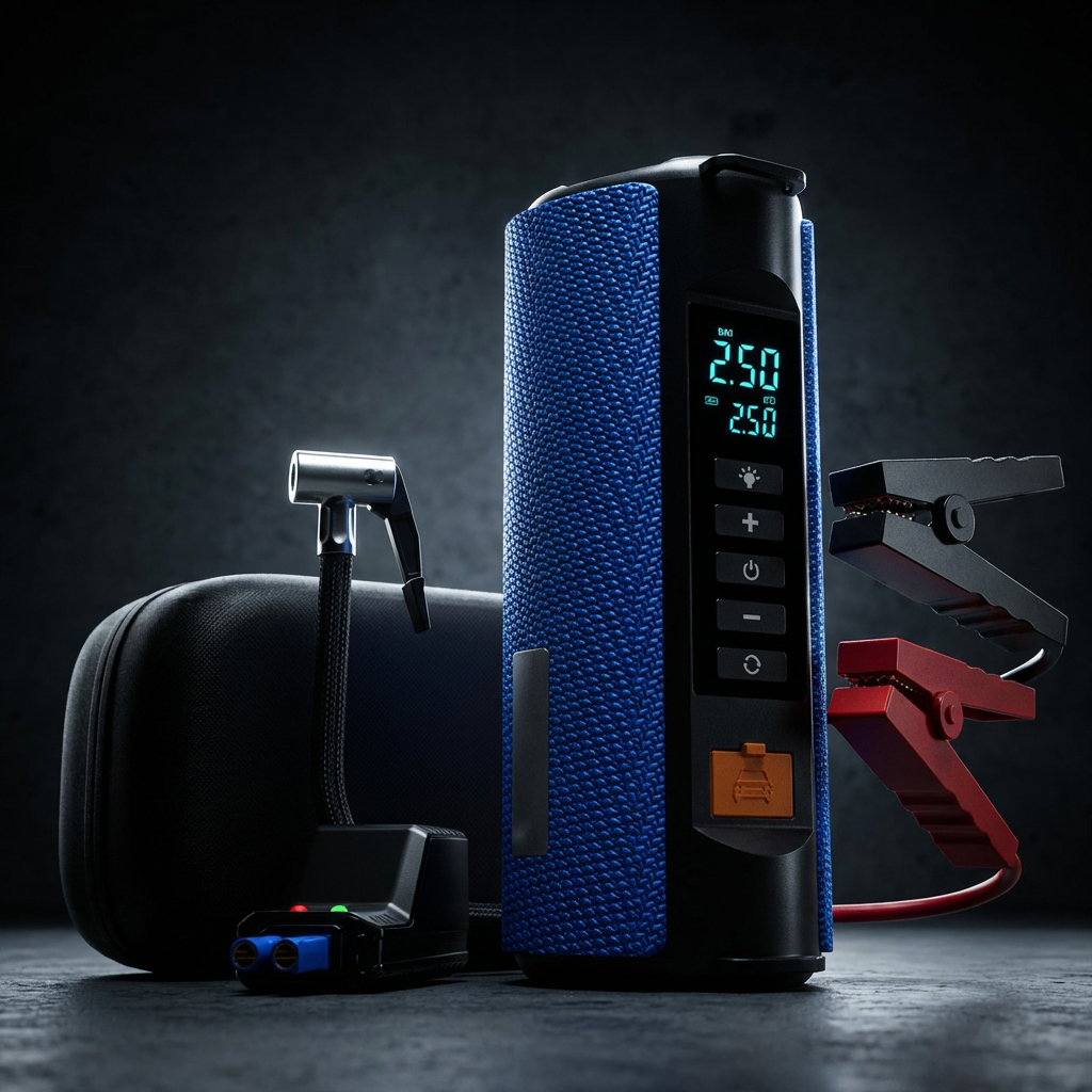 The Ultimate All-in-One Roadside Companion Never get stranded again with this heavy-duty 4-in-1 Car Jump Starter and Tire Inflator. Designed for ultimate peace of mind, this compact 10000mAh device combines a powerful 1000A jump starter, a 150PSI high-pressure air compressor, a fast-charging power bank, and a multi-mode emergency light into one rugged, portable unit. Whether you are on a long road trip, camping, or facing a roadside emergency, this tool provides the safety and power you need.